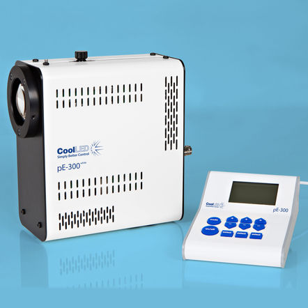 CoolLED pE-300 microscope illumination comes in 3 standard variants, each having a similar body and can be either mounted directly to the microscope system or attached with a liquid light guide.
